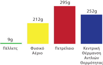 Στον παρακάτω πίνακα βλέπουμε την εκπομπή του διοξειδίου του άνθρακα (CO2) περιλαμβάνοντας στα στατιστικά στοιχεία και την διαδικασία παραγωγής του κάθε καυσίμου και συστήματος, είναι ξεκάθαρο ότι τα pellets έχουν την μικρότερη εκπομπή CO2.